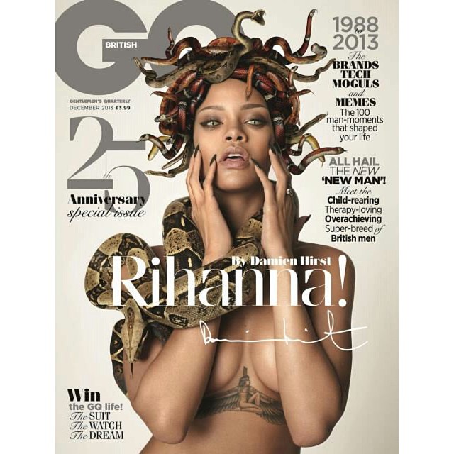 The Barbadian diva appears as a sultrier version of the Greek goddess Medusa on the 25th anniversary cover of British GQ which was shot by fame photographer and artist Damian Hirst.