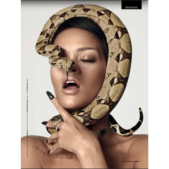 “Medusa head on me like I’m ‘luminati!!!! She. x Damien Hirst #GQ #25thAnniversary #COVER,I love playing with dominant animals! These 2 were double the trouble, but they’re superstars!!! #snakez #GQ #RiRi #88babies #25thanniversary’.”